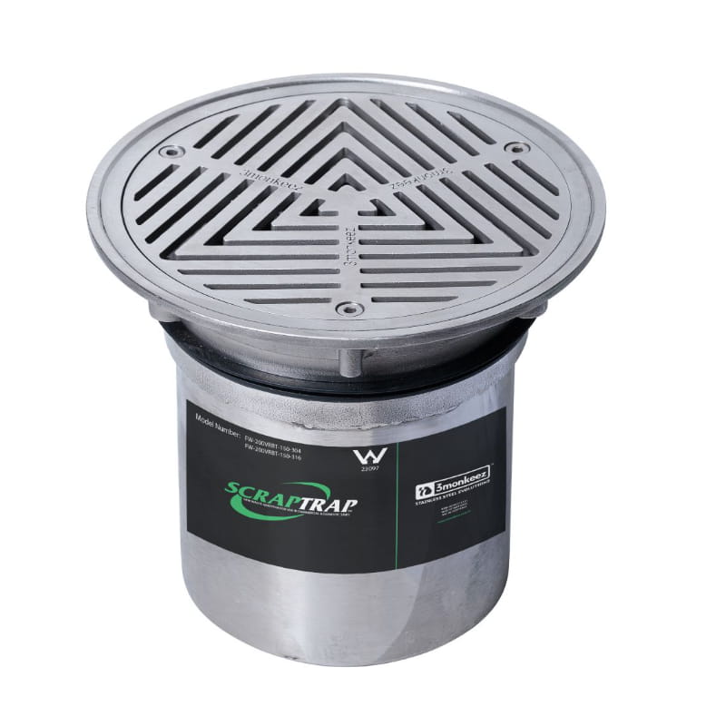 Floor Waste Arrestor (Complete Kit): The comprehensive trade waste solution. Includes the 200mm Vinyl Grate, clamping ring, secondary strainer, and a Removable Stainless Steel Basket (FW-200VBRT-150) to catch large debris and prevent 150mm line blockages.