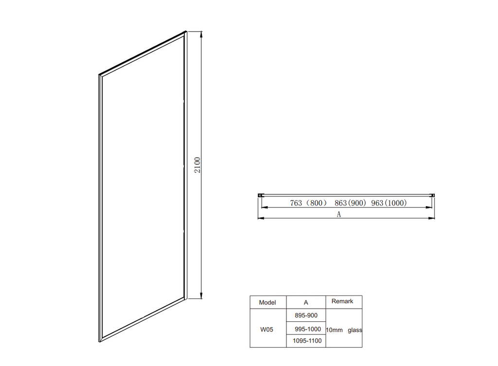 Note: Shower base, tray, and drain are not included. Installation must be carried out by an experienced, licensed glazier.