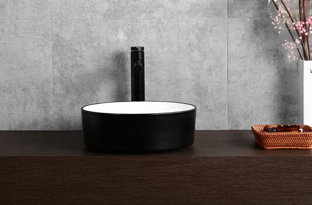 Bring a striking contrast to your bathroom with this 360mm round above-counter basin featuring a dual finish — gloss white interior and matte black exterior. Crafted from high-quality ceramic, it’s designed to blend timeless shape with a bold modern edge.