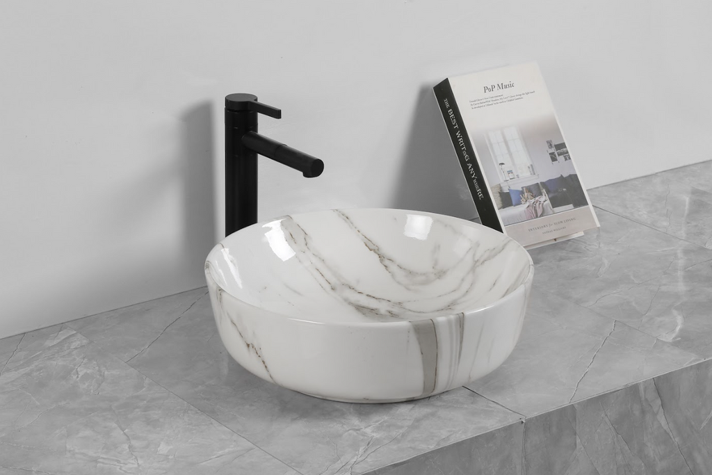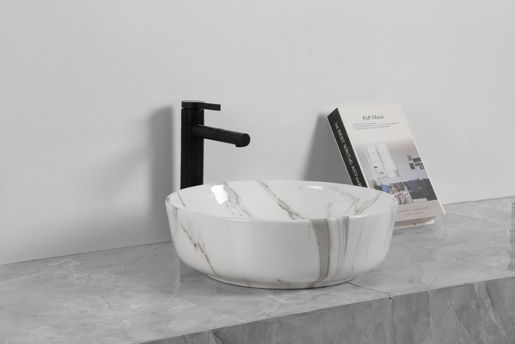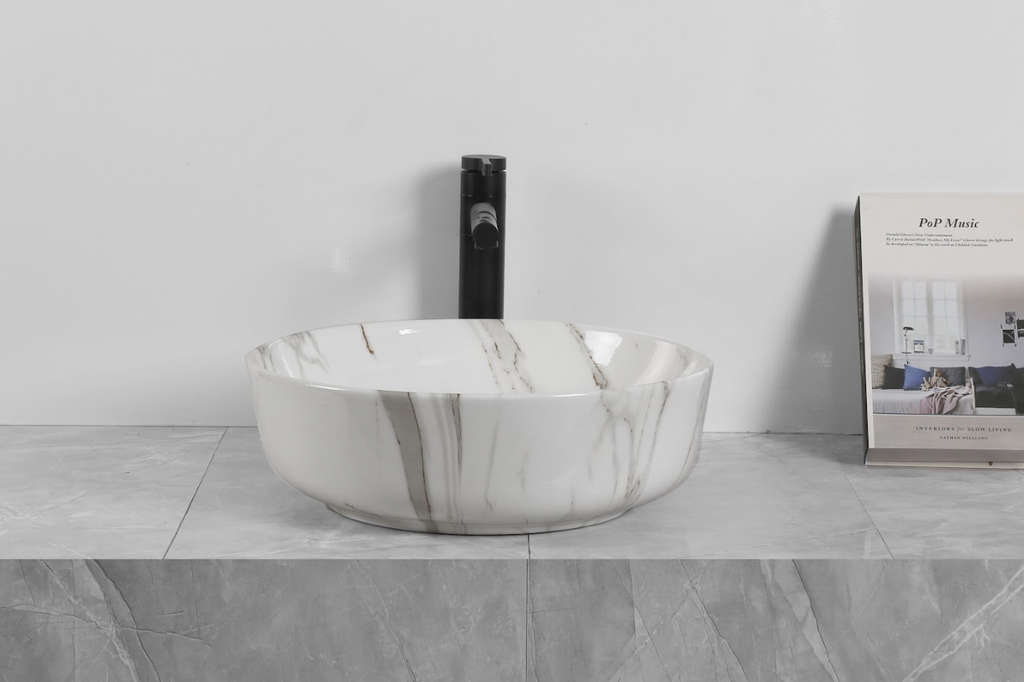 Elegant and practical, the Infinity 415mm Round Basin in Gloss Carrara finish offers a timeless marble look with the low-maintenance convenience of ceramic. Its smooth circular form and glossy surface add light and refinement to vanities of all styles.