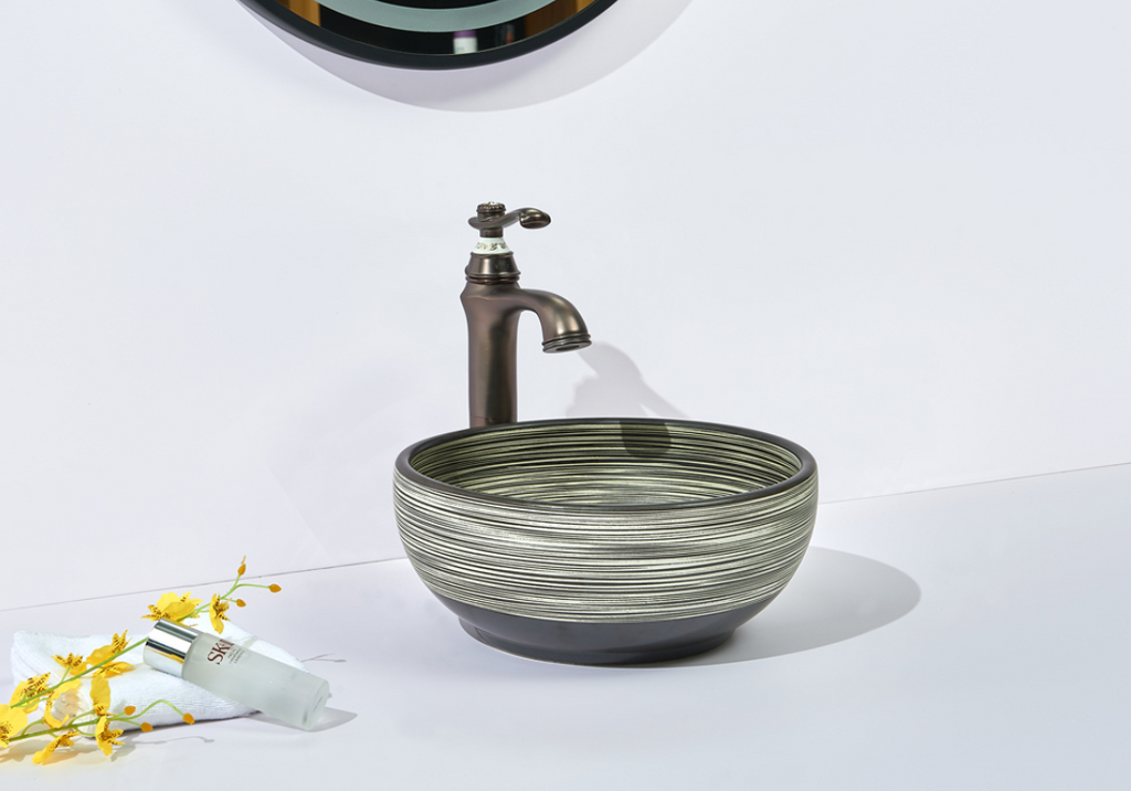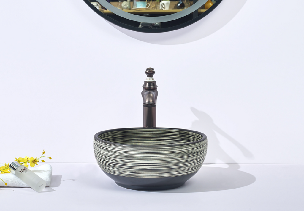 Add a bold design element to your bathroom with this round above-counter porcelain basin in Matte Black. Featuring a subtle stripe pattern, this compact basin delivers modern aesthetics with premium craftsmanship, ideal for contemporary spaces.