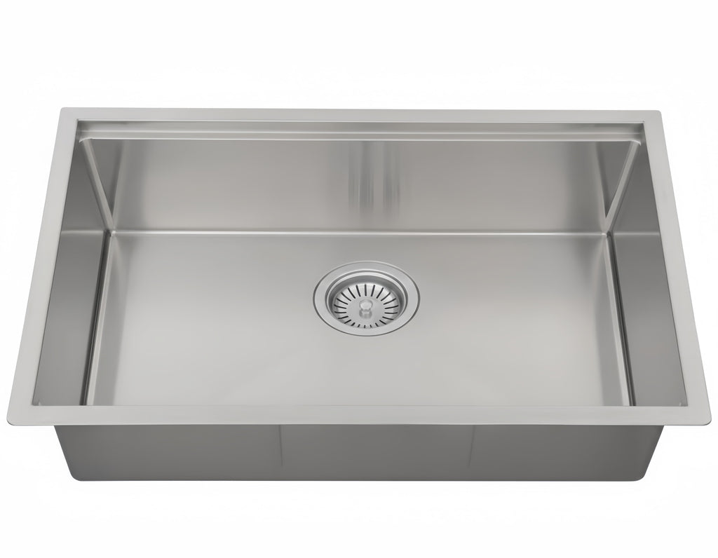 The Kliff LK-SSK-810 is a premium handmade single bowl sink, masterfully crafted for spacious modern kitchens, laundries, and butler's pantries. This generous $770\text{mm}$ (internal) sink is made from high-grade 304 stainless steel with a heavy-duty 1.2mm thickness. Featuring R15 radius corners, it offers a perfect blend of sleek contemporary lines and effortless maintenance.