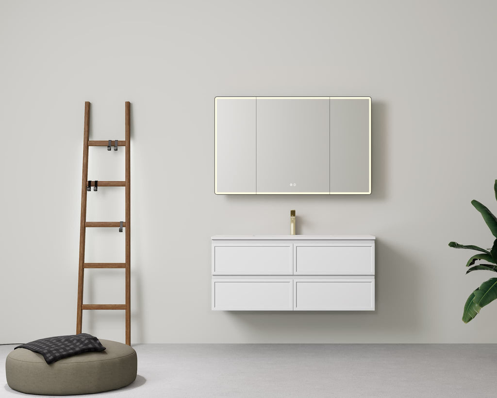 Exclusively at Secasa Home: The Lukka New Hamilton Federation Slim Wall Hung Vanity in elegant Matt White. This stunning piece seamlessly combines classic Federation V-groove detailing with a sleek, modern, wall-mounted profile, creating a bright and airy statement in any contemporary bathroom.